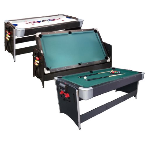 Why choose between billiards and table hockey when outfitting your rec room when you can enjoy the best of both? The Fat Cat 7-foot Pockey combination table is actually two tables in one. On one side is a billiards table with a 7-foot play surface, drop pockets, and a host of accessories, including two 57-inch cues, a set of 2-1/4-inch billiard balls, a plastic triangle, a billiard brush, and two pieces of chalk. On the other side is an air-powered table hockey table with a glossy white play surface. There's no better way to exercise your game-playing muscles without investing in two space-consuming individual tables.The Pockey table is user-friendly and intuitive. The table employs an exclusive latch system to lock securely in place--no wiggle, no tipping. When you're ready to switch games, simply unlock the latches and flip the table over. It's as easy as that. The table even includes an exclusive power cord channel through the spindle to prevent damage to the table cord. The table, which boasts a manual scoring system for the hockey side, includes hooks for the cues and storage racks for all accessories, including the four hockey pucks and four pushers.